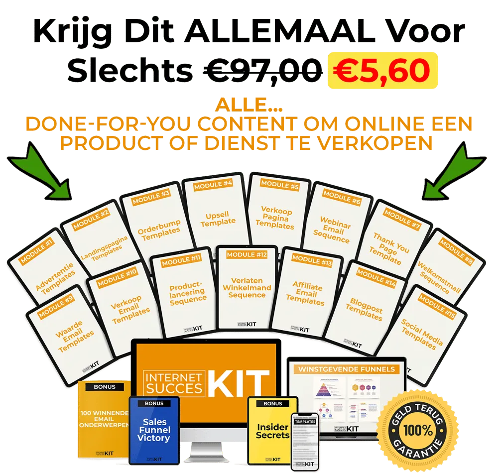 Als onderdeel van een promotiecampagne om recensies te verzamelen, wordt de “Internet Succes Kit" aangeboden voor de speciale prijs van slechts €97 €5,60. Natuurlijk kan deze aanbieding niet lang duren. Pak deze kans nu het nog kan…